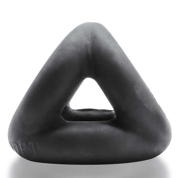 Oxballs Tri-Sport 3-Ring Cock and Ball Sling packaging in black silicone blend, Night Edition, with vibrant graphics.Oxballs Tri-Sport 3-ring cock and ball sling in black silicone, designed for enhanced grip and comfort.