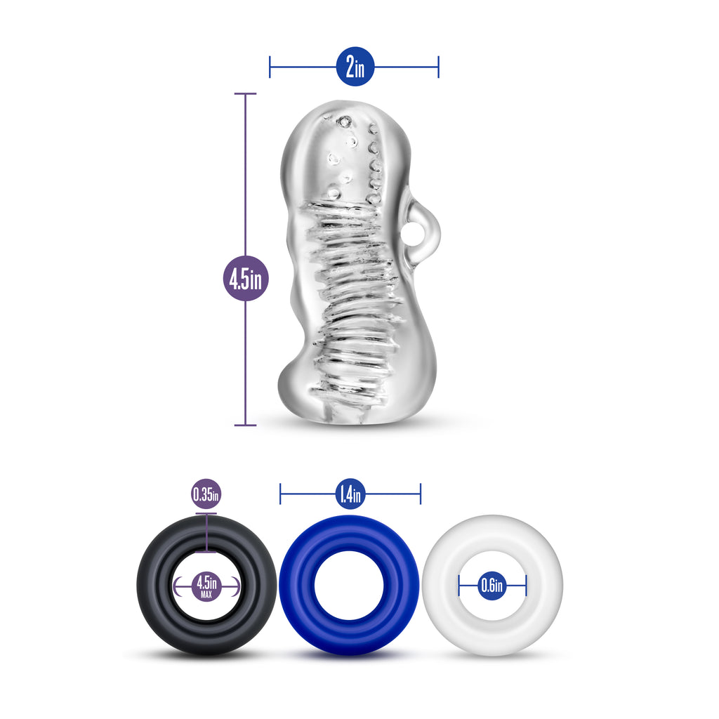The Jerk Off Kit includes a Hand Tool stroker, made from a body-safe, incredibly soft, and realistic elastomer. Squirt your favorite lube inside and slide your cock into Hand Tool's snug grip. The multi-textured chambers create a crazy variety of sensations, and the no-slip handle keeps everything under control. Use your Donut Rings at the base or around your shaft to build and hold the pressure.