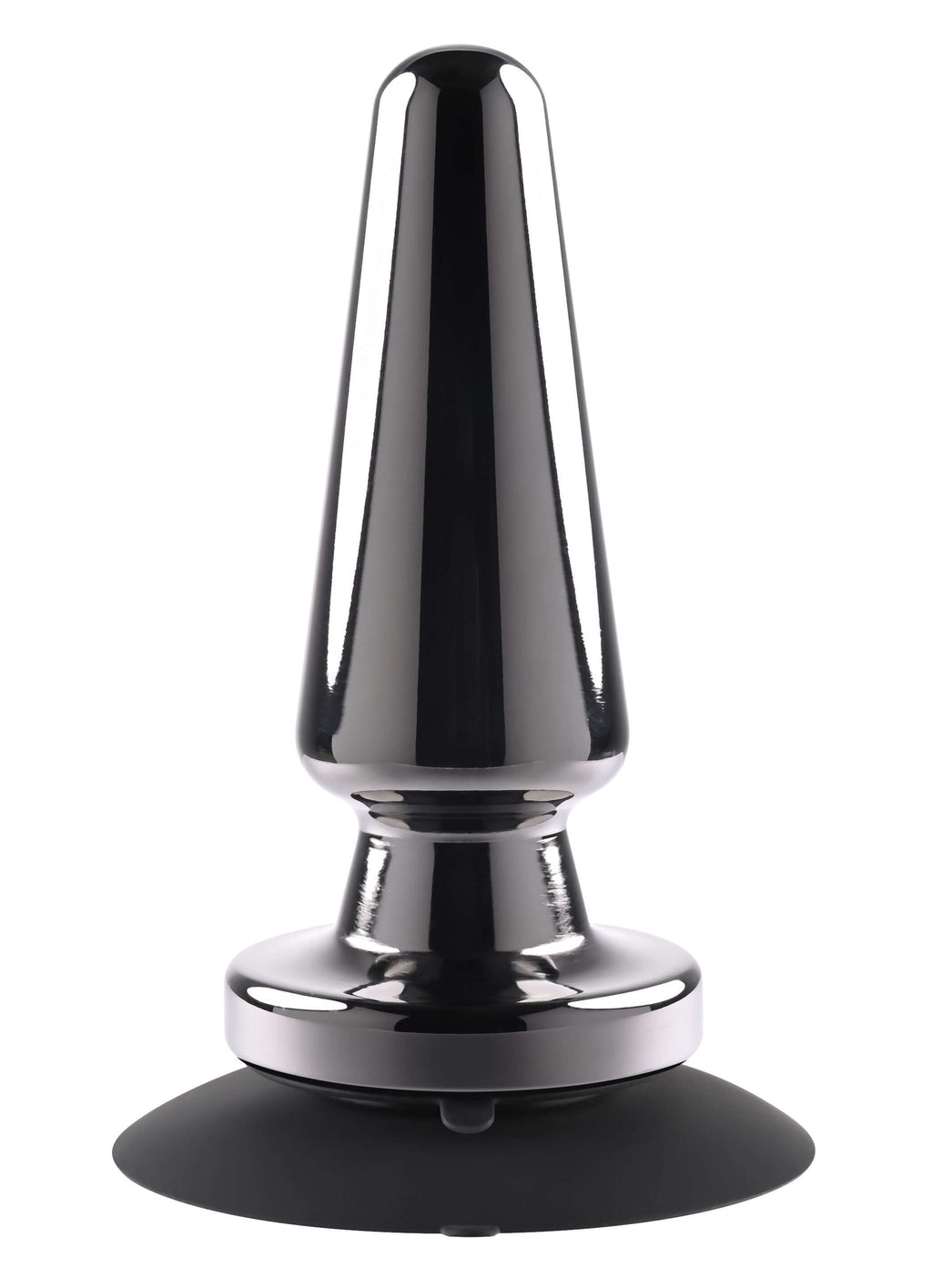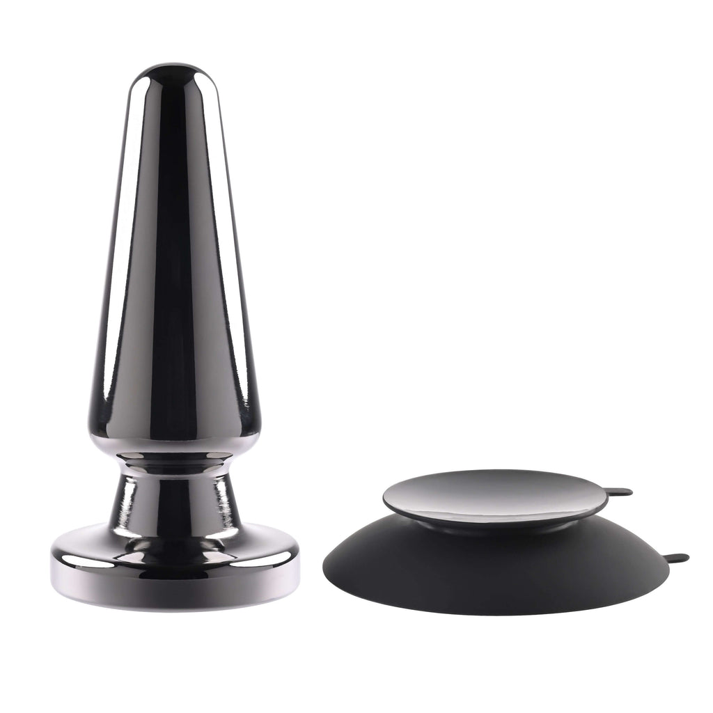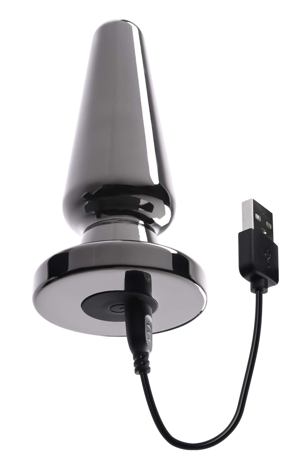 • Vibrating metal plug with suction cup base • Tapered shape with rounded tip • 7 vibrating speeds and functions • Powerful 2-sided suction cup – sticks to toy and surface • Easy to use 1-button control • Plug made from black chrome-finished aluminum alloy • Base and button made from silicone • Phthalate and latex free • Magnetic rechargeable, USB cable included • Waterproof and submersible