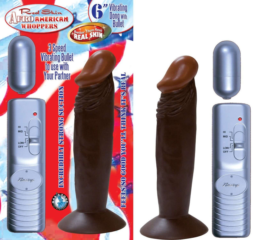 Real skin 6" (15.24 cm) vibrating dong with suction cup base. 2" (5.08 cm) vibrating bullet included to use with dual jack.