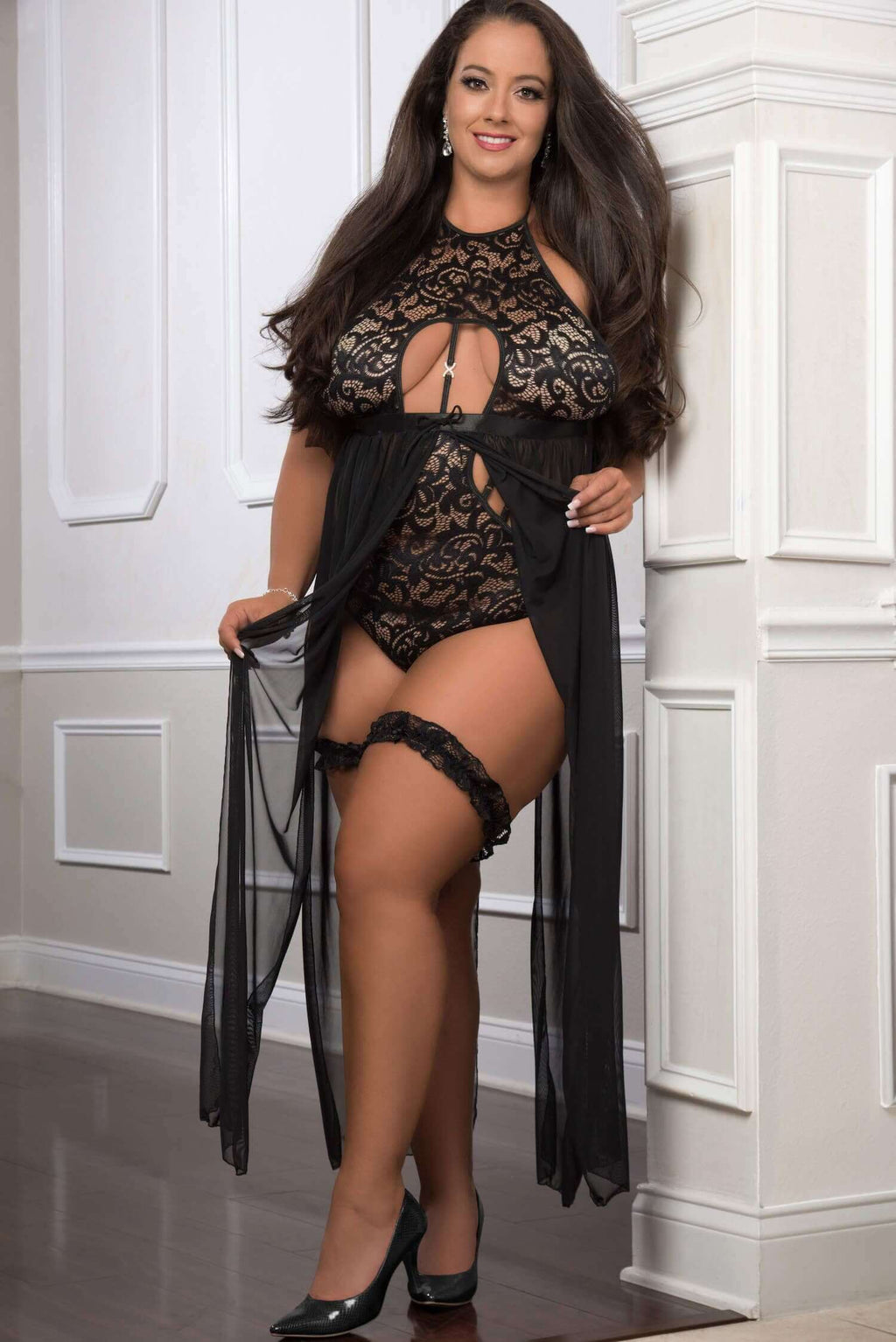 Black 2pc Flyaway Slitted Long Dress Teddy With - Snap Crotch and Laced Garters - Queen Size