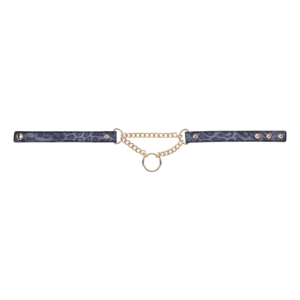 This elegant piece, crafted from animal-printed faux leather, is adorned with subtle gold hardware, making it a stylish accessory for any occasion. The gold ring that hangs from your neck can be used for playful tugs or to attach a leash, adding an extra layer of excitement to your encounters. Wear it as a bold statement or a discreet symbol of your wild side, and let your inner feline shine.
