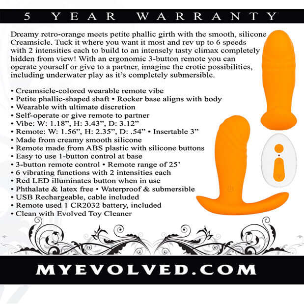 • Creamsicle-colored wearable remote vibe • Petite phallic-shaped shaft • Rocker base aligns with body • Wearable with ultimate discretion • Self-operate or give remote to partner • Vibrator Height: 3.43”, Depth: 3.12”, Width: 1.18” • Remote Height: 2.35”, Depth: .54”, Width: 1.56” • Insertable Length: 3” • Made from creamy smooth silicone • Remote made from ABS plastic with silicone buttons • Easy to use 1-button control at base • 3-button remote control • Remote range of 25’ • 6 vibrating functions with 2 intensities each • Red LED illuminates button when in use • Phthalate & latex free • Waterproof & submersible • USB Rechargeable, cable included • Remote used 1 CR2032 battery, included • Clean with Evolved Toy Cleaner • 5 Year Warranty