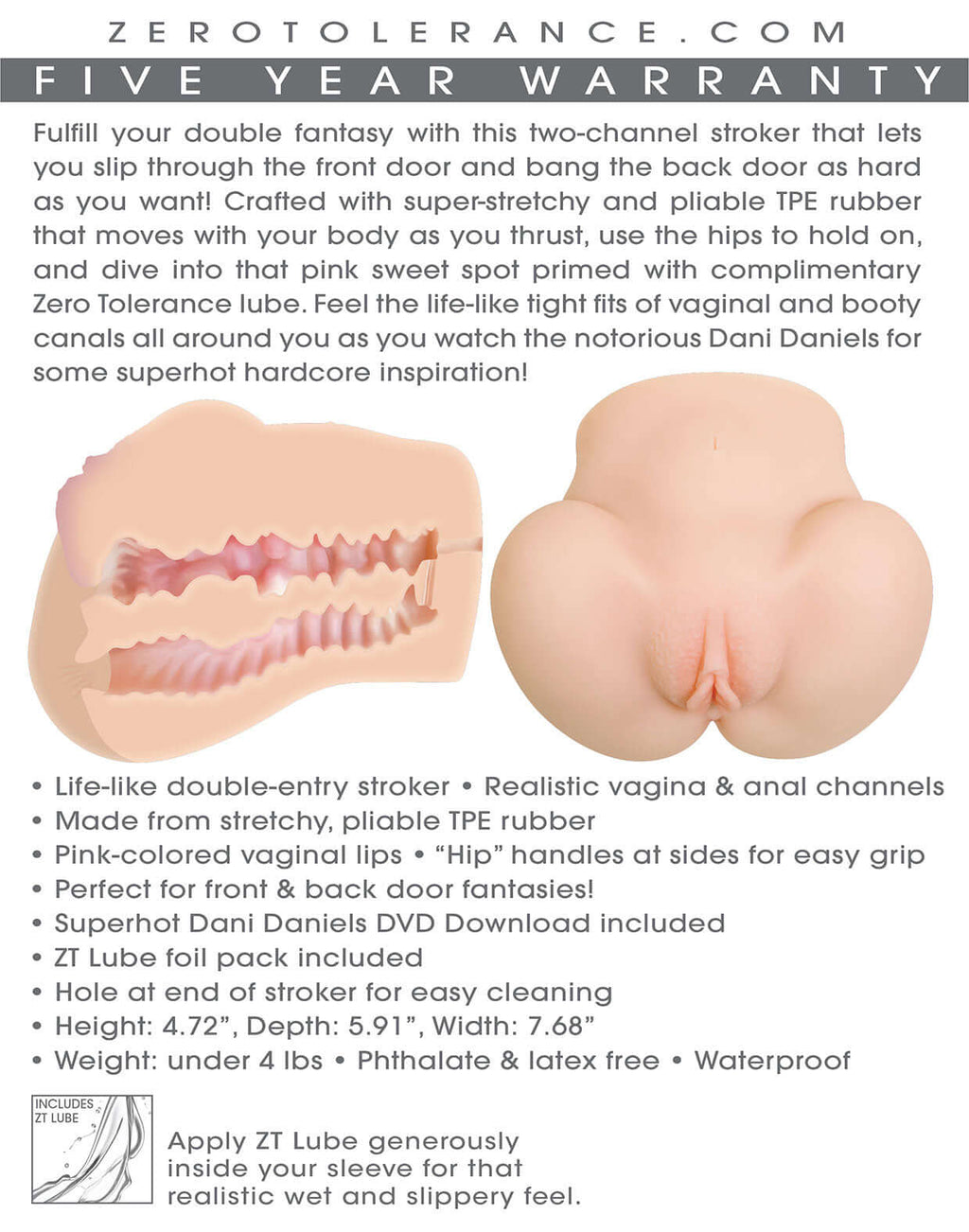 Fulfill your double fantasy with this two-channel stroker that lets you slip through the front door and bang the back door as hard as you want! Crafted with super-stretchy and pliable TPE rubber that moves with your body as you thrust, use the hips to hold on, and dive into that pink sweet spot primed with complimentary Zero Tolerance lube. Feel the life-like tight fits of vaginal and booty canals all around you as you watch the notorious Dani Daniels for some superhot hardcore inspiration!