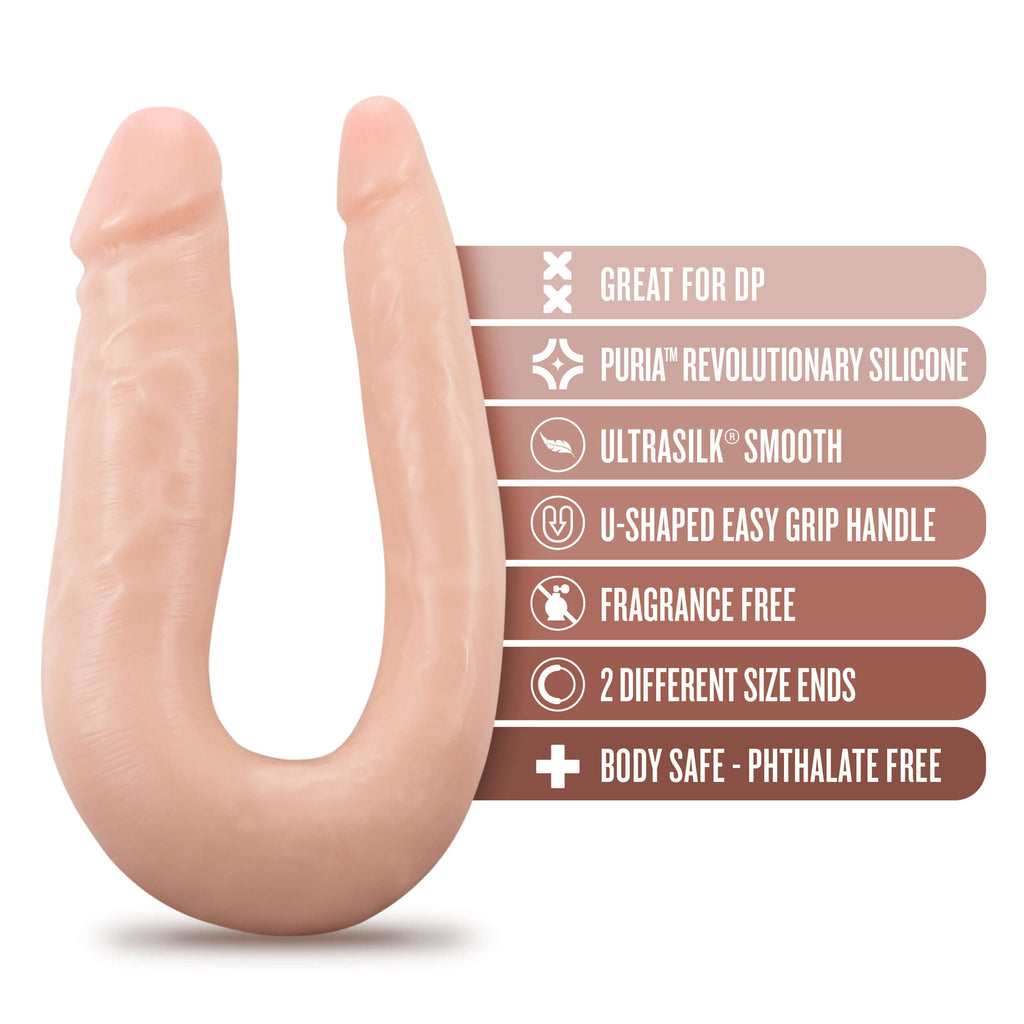The doctor will see you now! The Dr. Skin Silicone Mini Double Dong is open for practice, ready to aid you in exploring creative possibilities. This soft, U-shaped toy flexes and curves, making it ideal for double penetration or for comfortable use between partners. Grip its U-shape curve and move both heads for blended pleasure! Featuring 2 different-sized ends for comfort: slim on one side, and average girth on the other. Made of body-safe Puria platinum-cured silicone and enveloped in satin smooth Ultrasilk. Contains No Fragrances, Phthalates, Paraffins, or Latex and is easy to clean!
