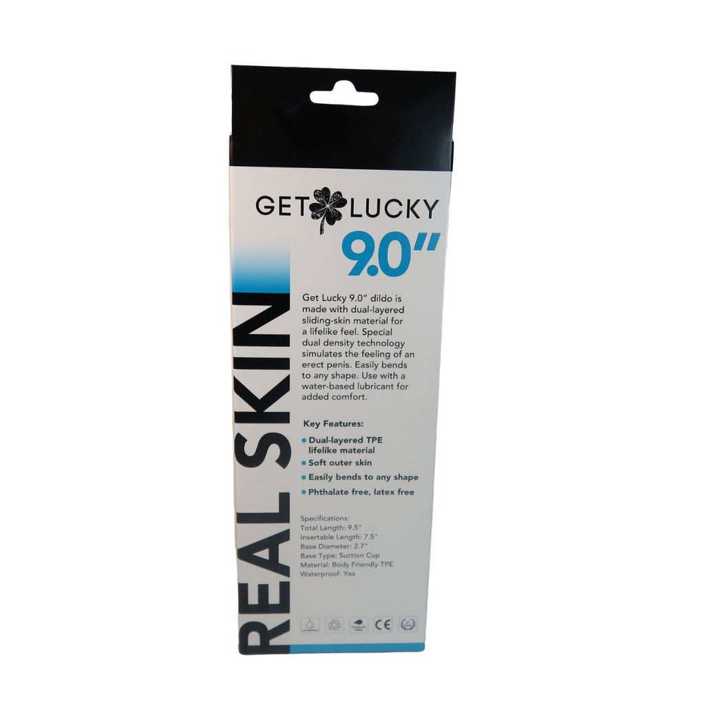 Get Lucky 9" dildo is made with dual-layered sliding-skin material for a life-like feel. Special dual density technology stimulates the feeling of an erect penis. Easily bends to any shape.