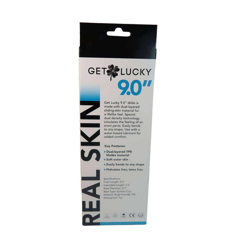 Get Lucky 9" dildo is made with dual-layered sliding-skin material for a life-like feel. Special dual density technology stimulates the feeling of an erect penis. Easily bends to any shape.