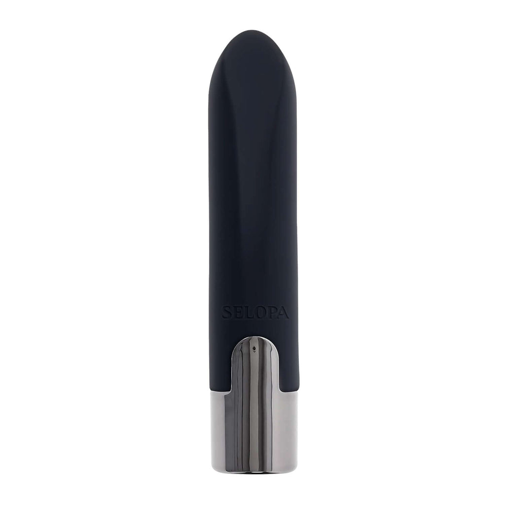 A powerful vibrating bullet made from creamy smooth silicone and a stylish chrome-finished base, featuring an angled, flat lipstick-shaped tip for targeted precision.