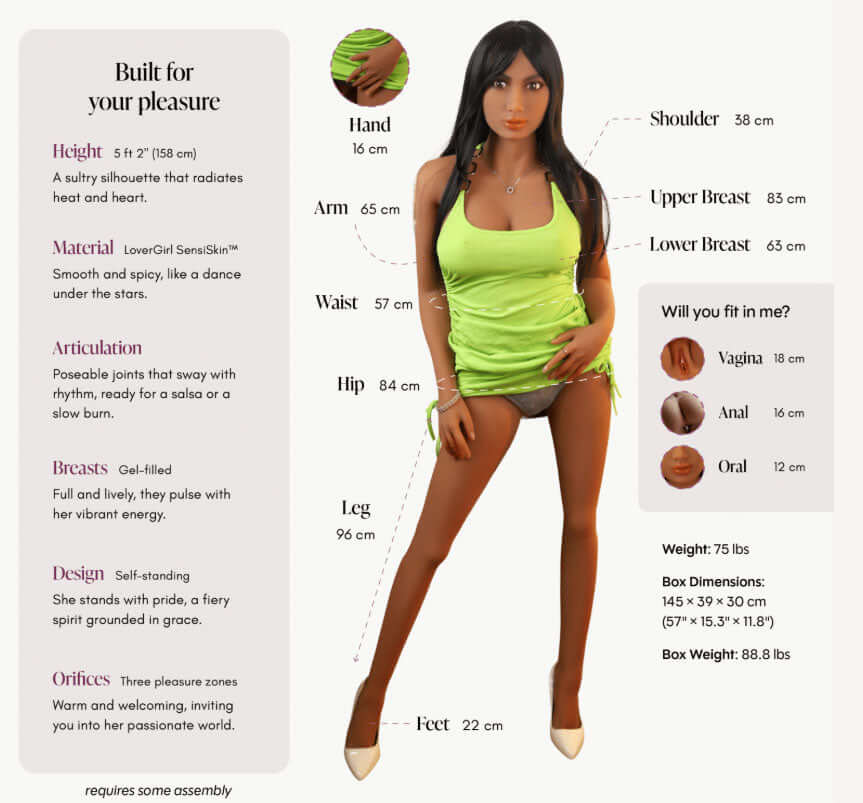 • Height: 5ft 2" / 158cm • Weight: 75 lbs • Appearance: Latin American, Dark brown Hair, Caramel color skin • Material: Lovergirl Sensiskin - Smooth and spicy, like a dance under the stars • Full Articulation: Poseable Joints engineered to mirror the complete range of movement for dynamic, natural poses. • Gel filled breasts • Self-Standing design, ingeniously balanced to stand on her own two feet, perfect for display and spontaneous positioning. • Three pleasure orifices. • Box Sleeve incuded Measurements: • Shoulder: 14.9" • Upper Breast: 32.6" • Lower Breast: 63cm • Hand: 6.3" • Arm: 25.6" • Waist: 24.4" • Hip: 33" • Leg: 37.8" • Feet: 8.7" • Vagina: 7" • Anal: 6.3" • Oral: 4.7" • Clothing NOT included