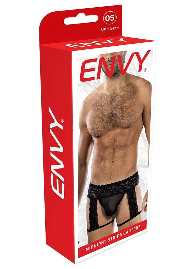 Unleash your seductive side with the Midnight Stride Garter, a provocative men`s piece designed to intrigue and excite. This striking design features an elasticized waist leading to a sheer, form-fitting pouch at the front for maximum definition, while wide panels of delicate black floral lace extend down the thighs, creating a sophisticated and daring aesthetic. Adjustable garter-style straps wrap securely around the legs, ensuring a comfortable fit for all-night wear and completing the undeniably alluring look that is perfect for special occasions, bedroom play, or as a confident layering statement.