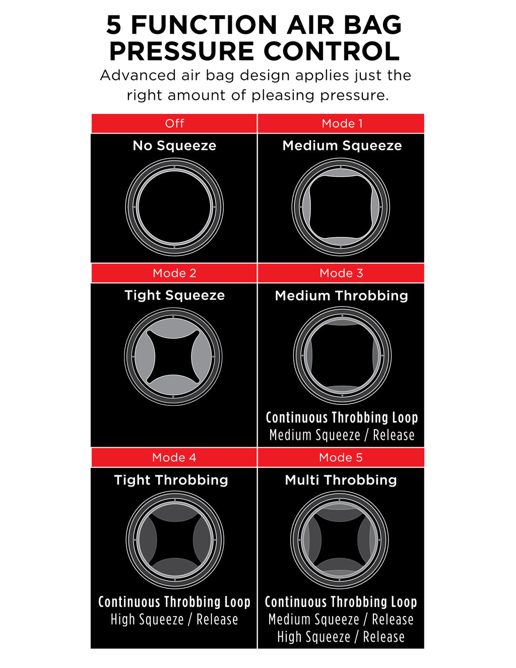 Operating Instructions: Vibration: To activate the vibration fuction, press the top button once. Press again to cycle through speeds and patterns. To turn off vibration, press and hold the top button for three seconds. Air Bags: To active the air bag function, press the bottom button once. Press again to cycle through modes. To turn off air bags and release pressure, press hold the bottom button for three seconds.