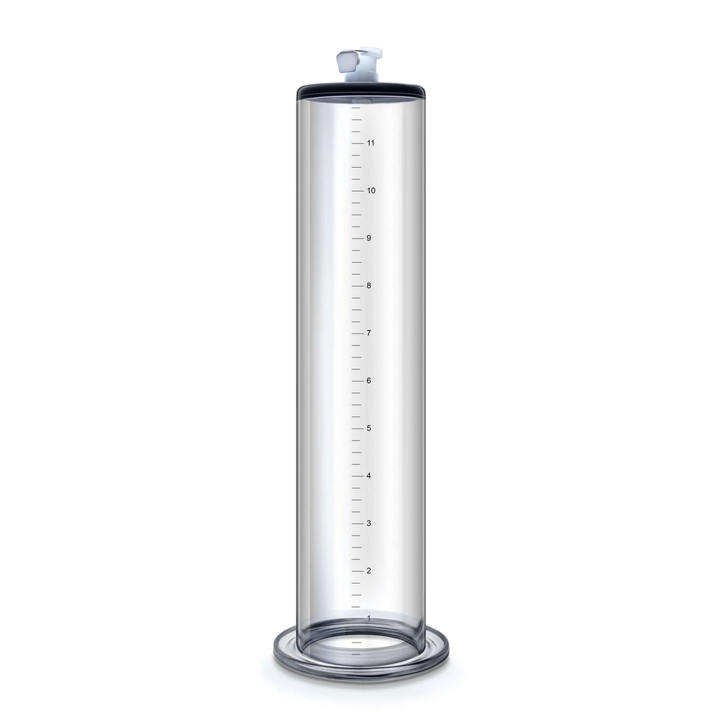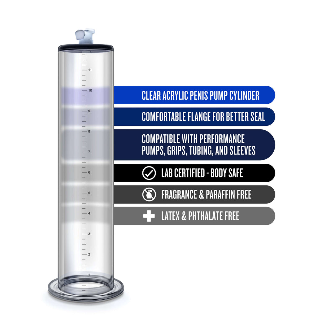 Find your perfect size with the Performance Penis Pump Cylinders. This crystal-clear cylinder delivers 2.5" diameter by 12" total length. Its comfortable flange ensures a better seal. Use this cylinder with any Blush Performance pump and accessories for a more personalized fit. Made of body safe acrylic, the Performance Pump Cylinder is easy to use and easy to clean.