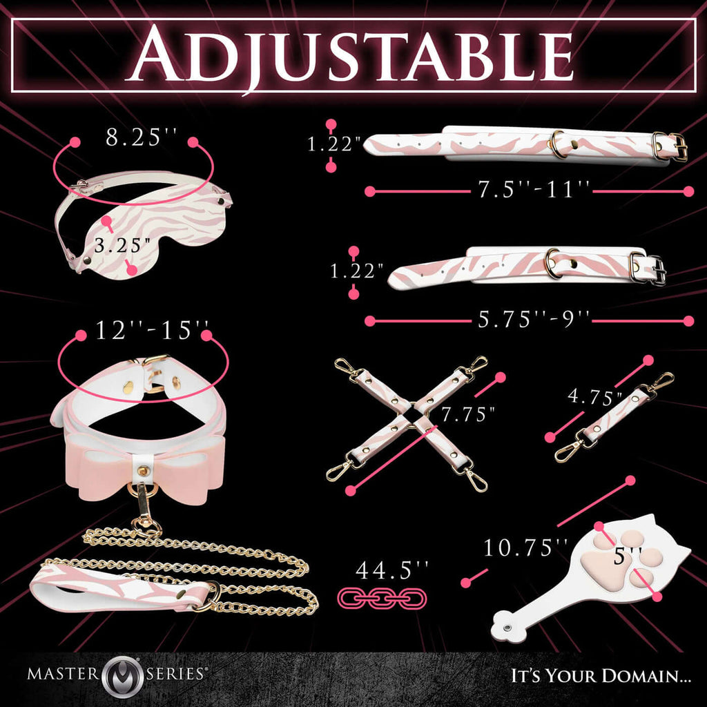 The perfect tiger kitty kit to make you go ""UWU""! Dress up yourself or your partner in bondage that really makes a statement. This unique rose pink, soft peach and white set is made out of vegan friendly leather and held together with beautiful gold plated metal rivets. Included in the kit are pairs of wrist and ankle cuffs, a kitty collar with a bow, faux leather blindfold, a 4 strap hogtie to hold wrists and ankles together, and an adorable kitten-paw paddle! The leather is white with a rose pink tiger stripe print all over it. Each of the cuffs are adjustable for comfort and have D-rings for the hogtie or other bondage gear to attach to. The long, golden chain connects to the cute kitty collar and has a leather handle. The paddle is shaped like a cat head but has a plush, padded side with a large cat's paw print on it that is cushioned and feels thuddy and a flat side that offers a more stingy feeling. All metal is nickel-free for sensitive skin. Spot clean vegan leather as needed by spraying with toy cleaner and wiping dry with a soft cloth.