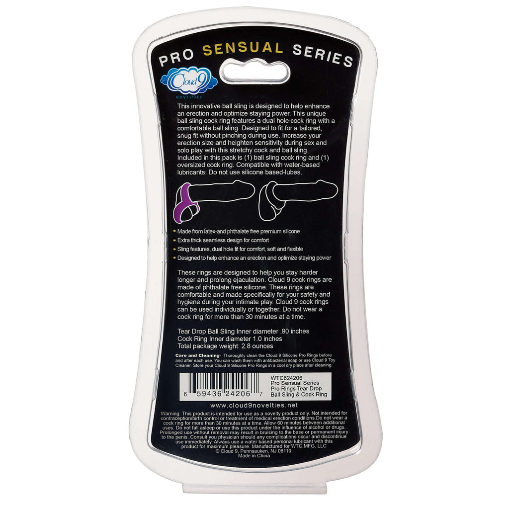 This innovative ball sling is designed to help enhance an erection and optimize staying power. This unique ball sling cock ring features a dual hole cock ring with a comfortable ball sling. Designed to fit for a tailored, snug fit without pinching during use. Increase your erection size and heighten sensitivity during sex and solo play with this stretchy cock and ball sling. Included in this pack is (1) ball sling cock ring and (1) oversized cock ring. Compatible with water-based lubricants. Do not use silicone based-lubes.