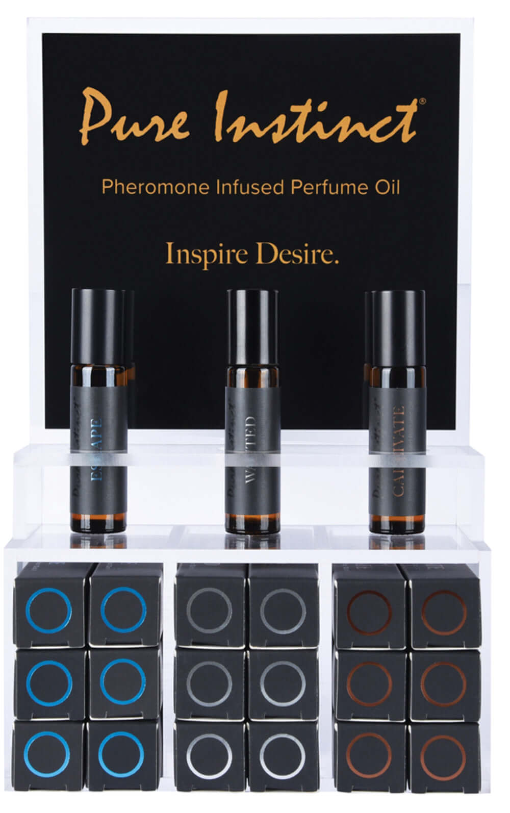 Pheromone Perfume Oils Display. Cultivate confidence and express a magnified version of yourself with CG pheromone infused perfume oils. All specially formulated to blend with skin pH, provide a unique on-of-a-kind scent and boost sex appeal! This pure instict Acrylic Cube Display comes with 22 pcs.