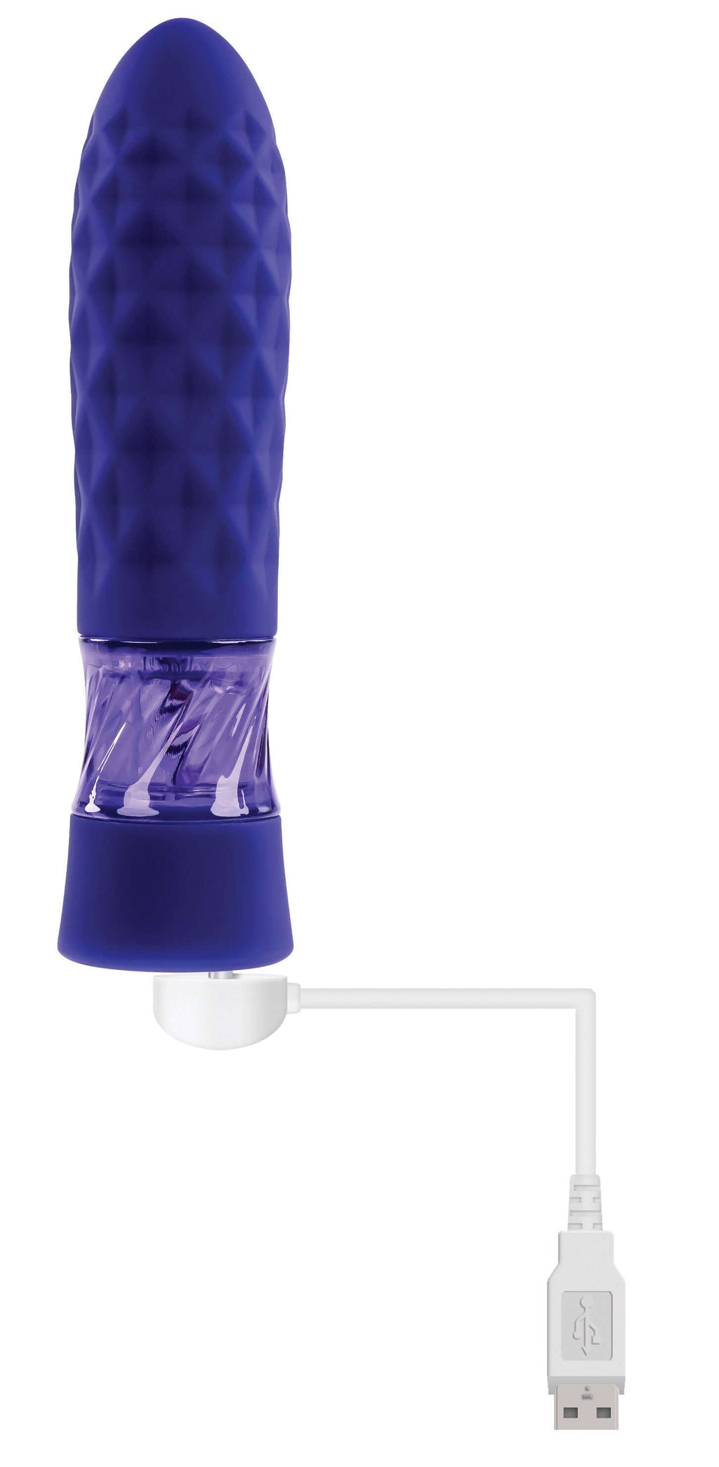 • Powerful, light-up vibrating bullet • Dynamic, multi-color LED lights illuminate base • 8 powerful vibrating speeds and functions • Diamond shaped textures for stimulation and better grip • Easy to use 1-button control panel • LED light illuminates button at base when in use • Made from creamy smooth silicone • Light-up window made from ABS plastic • Waterproof and submersible • Phthalate and latex free • Magnetic Rechargeable, USB cable included