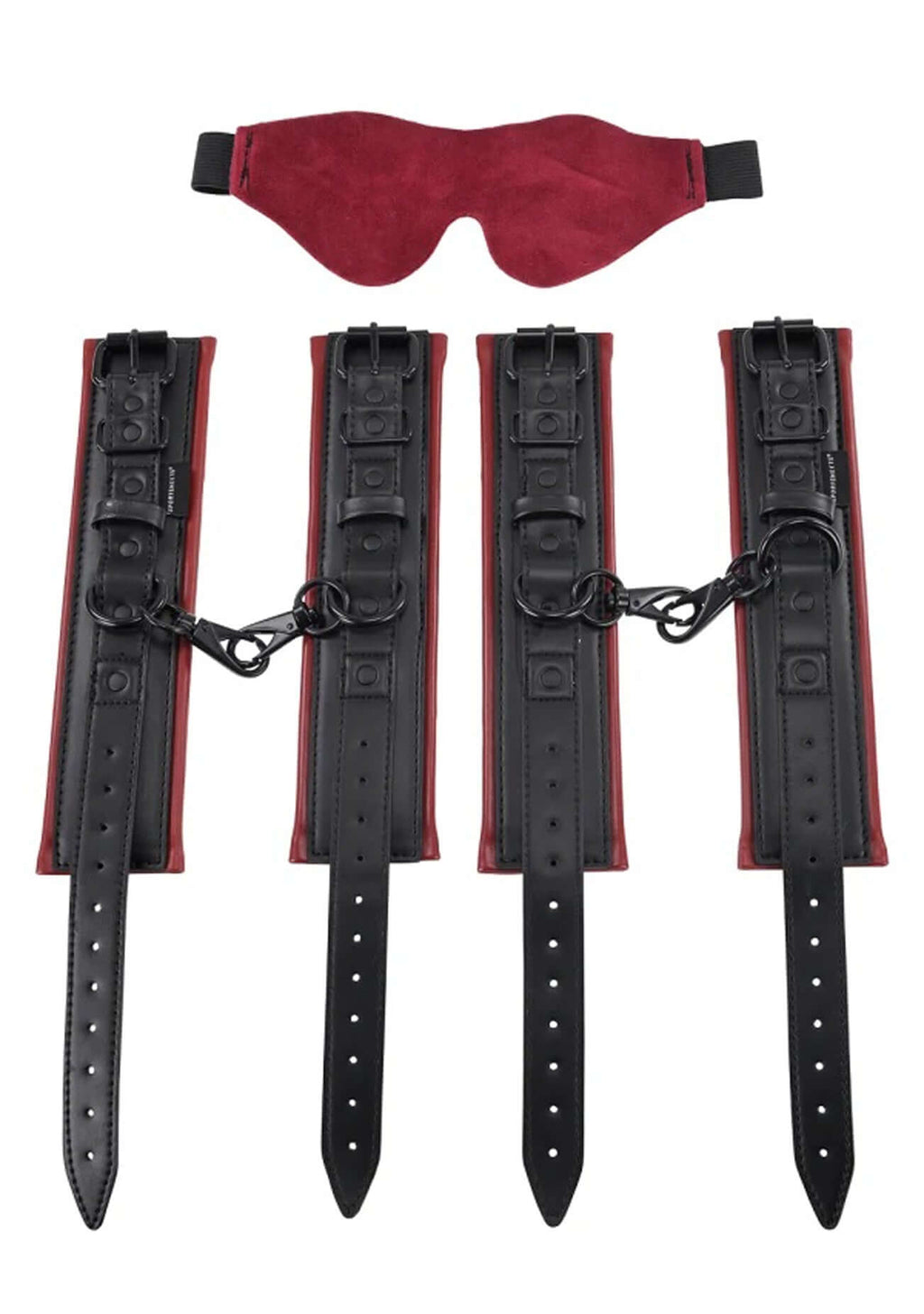 The original (yes, we invented it) Under the Bed Restraint System just got a sultry and seductive new look! Set up in minutes, the alluring deep reds create a lust filled setting made for the naughtiest play. Four luxurious adjustable cuffs in soft and supple faux leather with restraint straps secure to one center connector strap fitting securely under your mattress.