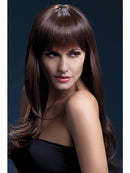 Brown long feathered wig with fringe. Heated styling tool compatible. Heat resistant up to 120 degrees celcius to 248 degrees fahrenheit. Fully adjustable wig cap for secure fit. Professional quality synthetic wig. Overall length 26 inches.