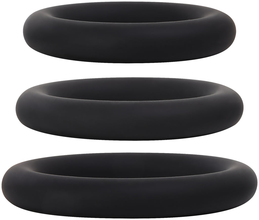 • 3 piece penis ring set • Soft & stretchy silicone rings in 3 sizes - a great silicone value! • Prolongs & strengthens erections Great for couples or solo play • Graduated sizes for different intensities • Made from smooth, supple body-safe silicone, phthalate & latex free • Small: outer diameter: 1.33 inches inner diameter • Medium: outer diameter: 1.5 inches inner diameter • Large: outer diameter: 1.75 inches inner diameter • Can be worn in or out of water