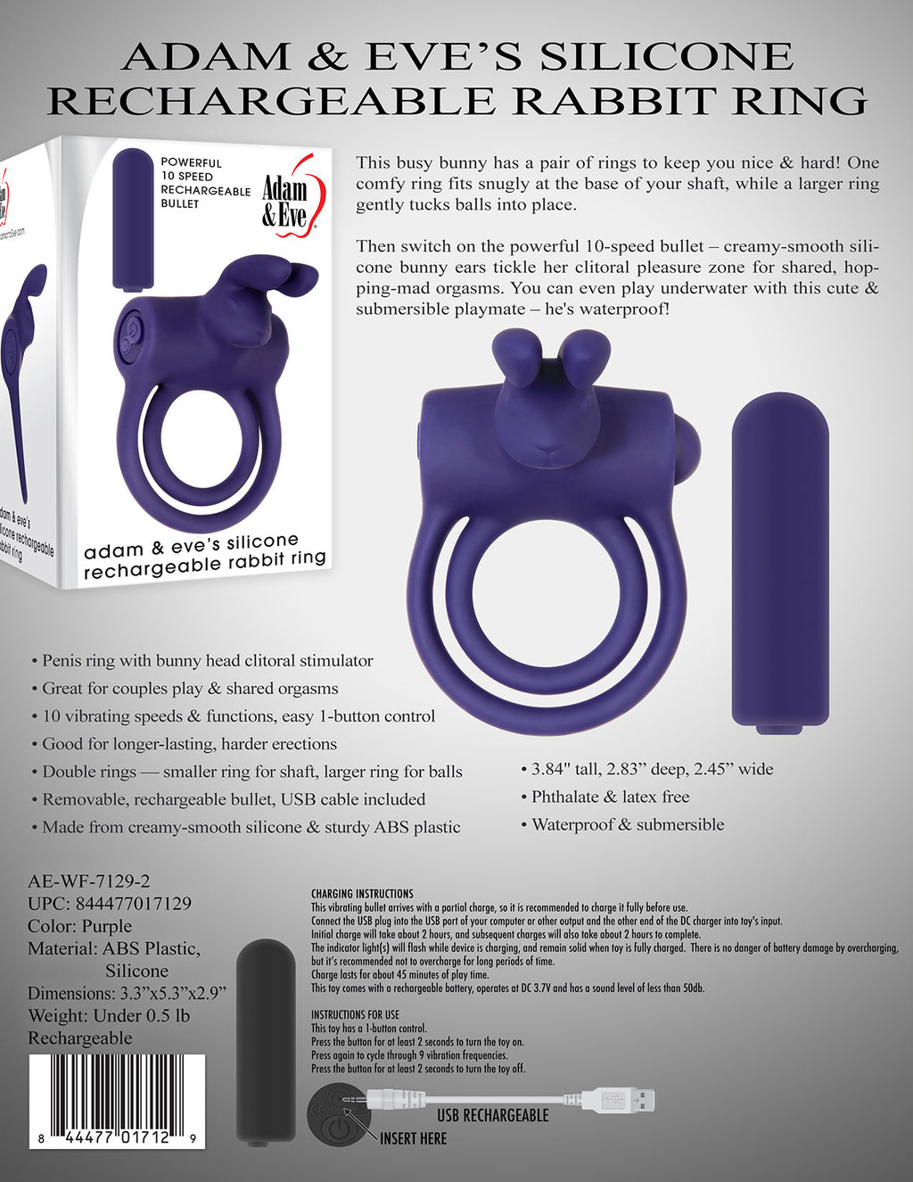 • Penis ring with bunny head clitoral stimulator • Great for couples play and shared orgasms • Good for longer-lasting, harder erections • Double rings - smaller ring for shaft, larger ring for balls • Removable, rechargeable bullet, USB cable included • Made from creamy-smooth silicone & sturdy ABS plastic • 3.84" tall, 2.83" deep, 2.45" wide • Phthalate and latex free • Waterproof and submersible