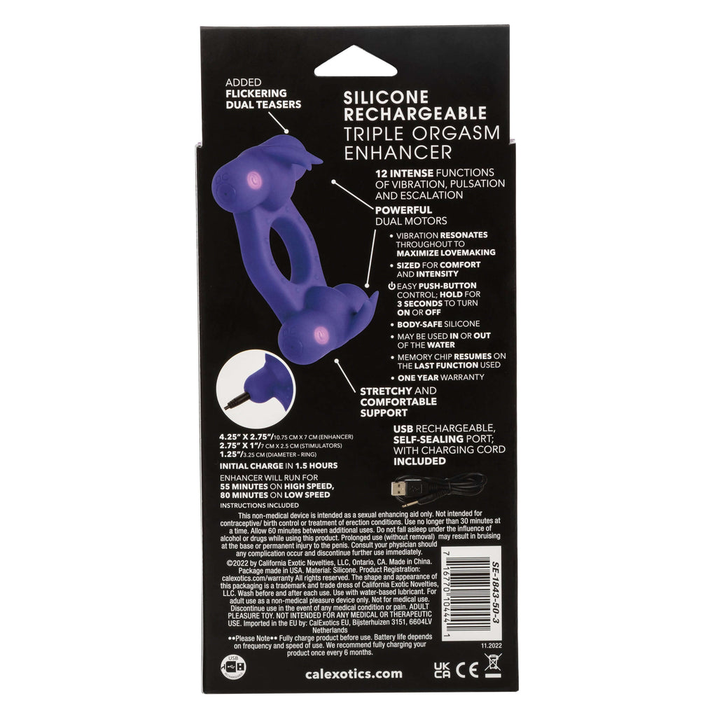 Maximize your pleasure when you slip into the Silicone Rechargeable Triple Triple Orgasm Enhancer. While the stretchy ring holds tight, the thrilling dual teasers deliver full-contact stimulation to multiple pleasure zones.