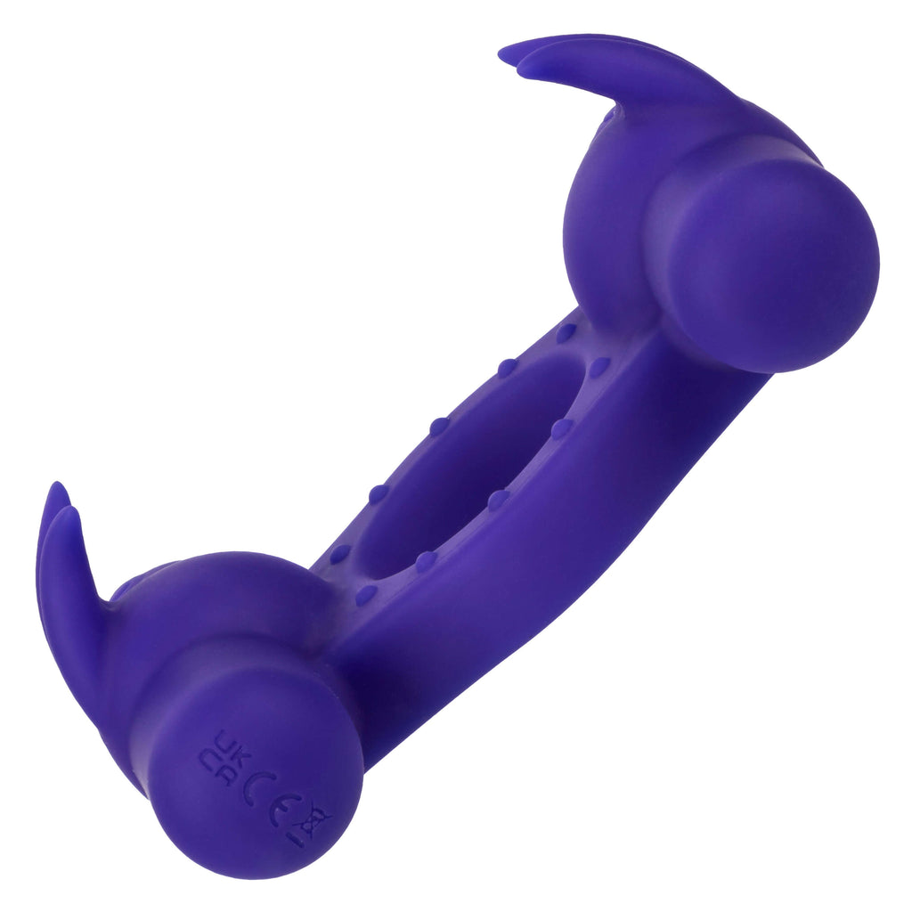 • Stretchy and comfortable vibrating couples enhancer with flickering dual teasers • 12 intense functions of vibration, pulsation and escalation • Dual independent motors • Enhances stimulation for you and your partner • Luxurious body-safe Silicone • State-of-the-art memory chip resumes on last function used • Security travel lock feature – hold for 3 seconds to turn on or off • USB rechargeable – dual charging cord included • Complete charge in 1.5 hours (each motor • Runs for 55 minutes on high speed and 80 minutes of low speed (each motor) • 4.25” x 2.75”/10.75 cm x 7 cm (enhancer), 2.75” x 1”/7 cm x 2.5 cm (each stimulator), 1.25”/3.25 cm (diameter - ring)