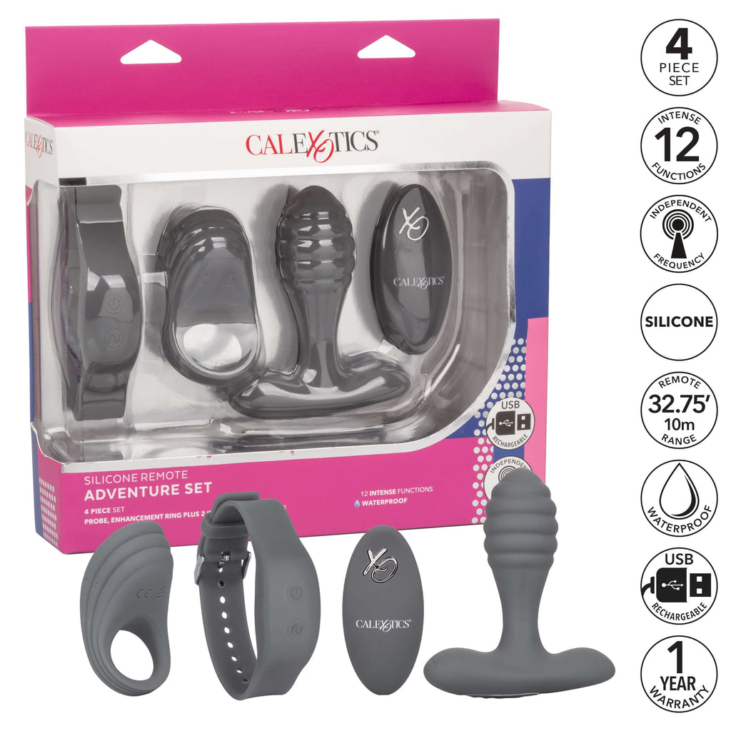 Whether you want to get down and dirty with a partner or indulge in sensual solo time, this thrilling Silicone Remote Adventure Set is a versatile pleasure experience. The wickedly naughty set includes an Ultra-Soft™ Probe with wristband remote control and ribbed enhancement ring with discreet handheld remote.