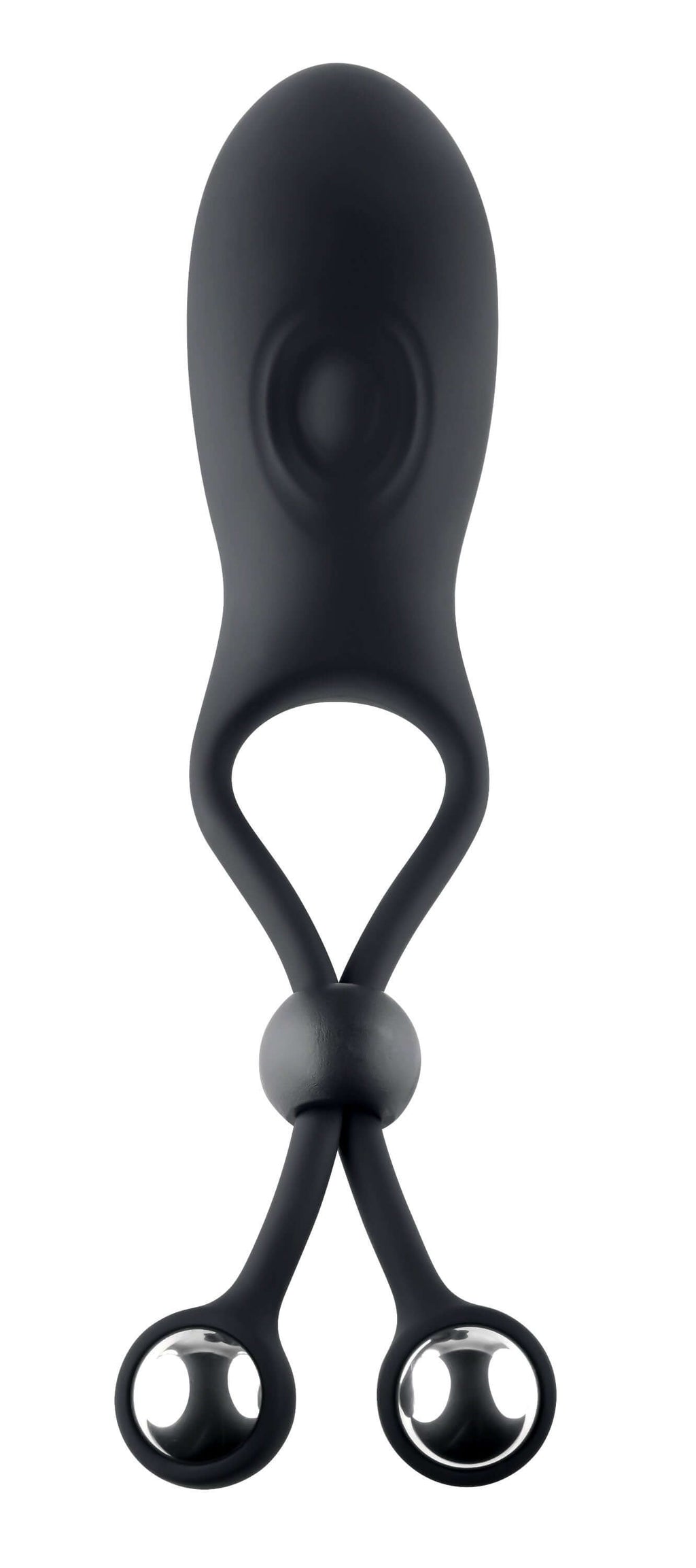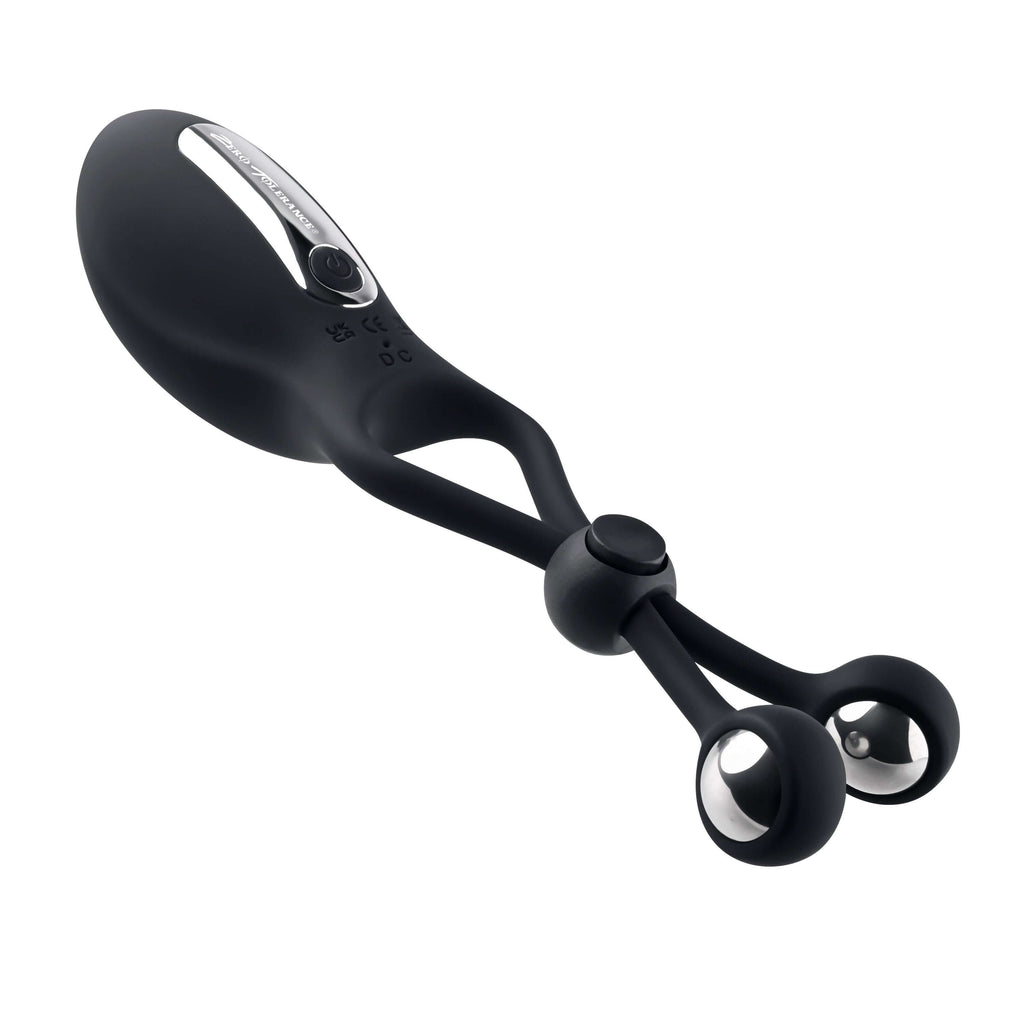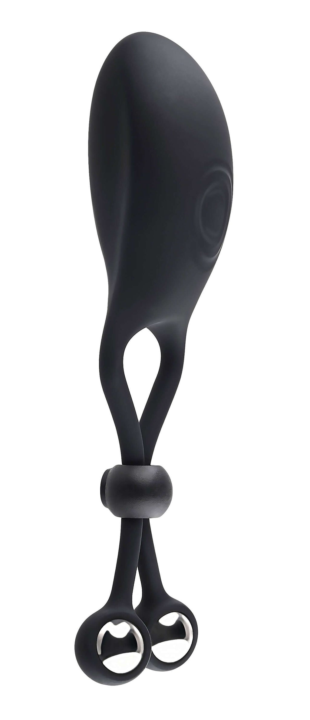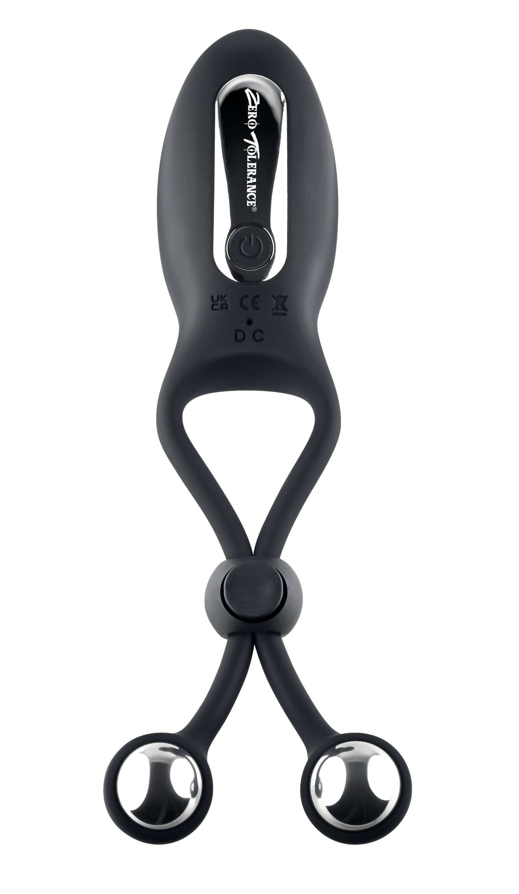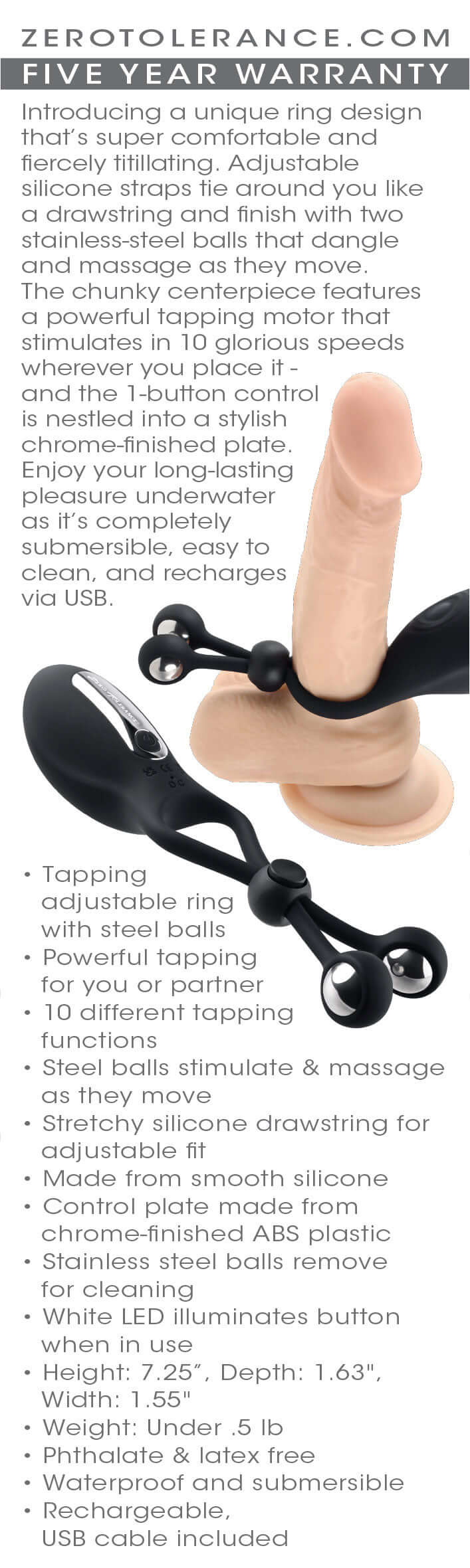 Introducing a unique ring design that’s super comfortable and fiercely titillating. Adjustable silicone straps tie around you like a drawstring and finish with two stainless-steel balls that dangle and massage as they move. The chunky centerpiece features a powerful tapping motor that stimulates in 10 glorious speeds wherever you place it - and the 1-button control is nestled into a stylish chrome-finished plate. Enjoy your long-lasting pleasure underwater as it’s completely submersible, easy to clean, and recharges via USB.