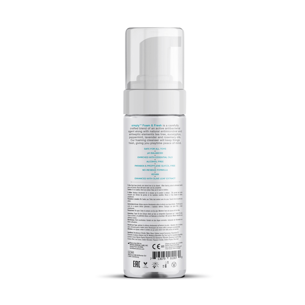 Wicked Simply Foam & Fresh Toy Cleaner 7 Oz combines an active antibacterial agent with natural antimicrobial and antiseptic elements, including tea tree, eucalyptus, peppermint, lavender, and rosemary oils. This thoughtful blend works to eliminate harmful germs and bacteria while leaving toys clean and refreshed. The light foaming action allows the cleanser to reach grooves, textures, and hard-to-clean areas, providing thorough coverage without harsh scrubbing.